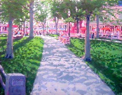 I painted a four-season series of Winthrop Park in the late nineties. Here is a new version of the series. Changes in the park since then: whole new Coffee & Tea house moved in (upper-right) and the old Pi Eta club, now a couple of restaurants, got a facelift with the white facade (upper-middle). New benches, umbrellas, and gas lights too. Winthrop Park, Harvard Square, 4 Seasons, oil on canvas 16x20" $250. each